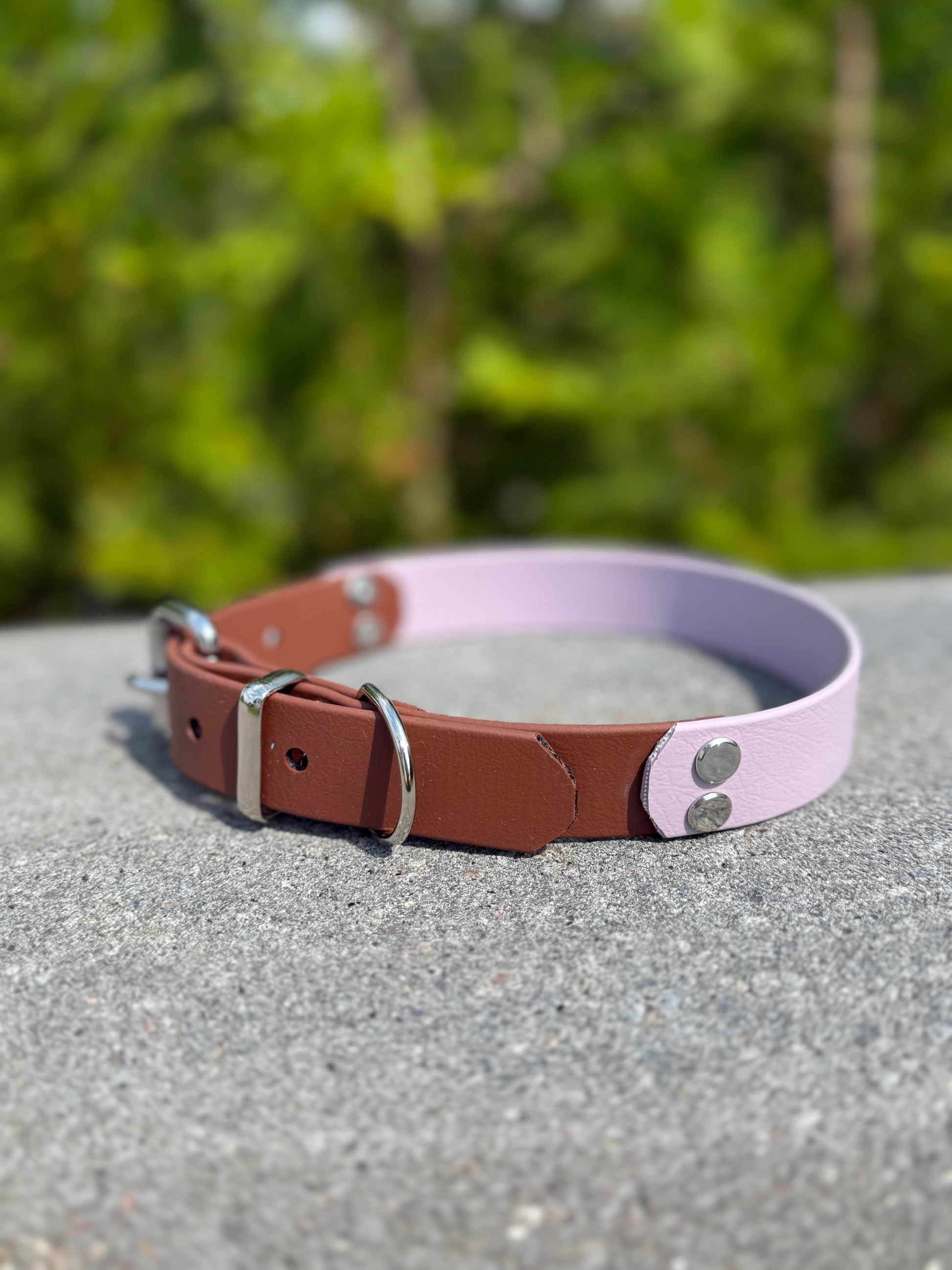 Våra handgjorda halsband i biothane är inte bara snygga - de är också slitstarka, vattentåliga och lätta att rengöra. Ett perfekt val för både vardag och äventyr, oavsett väder. Halsbandet känns mjukt mot hundens päls och tål både regn, bad, lera och lek.