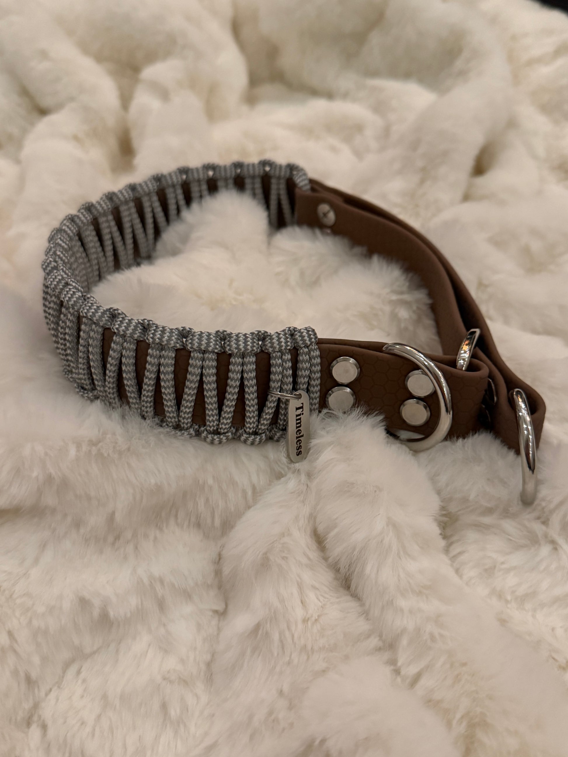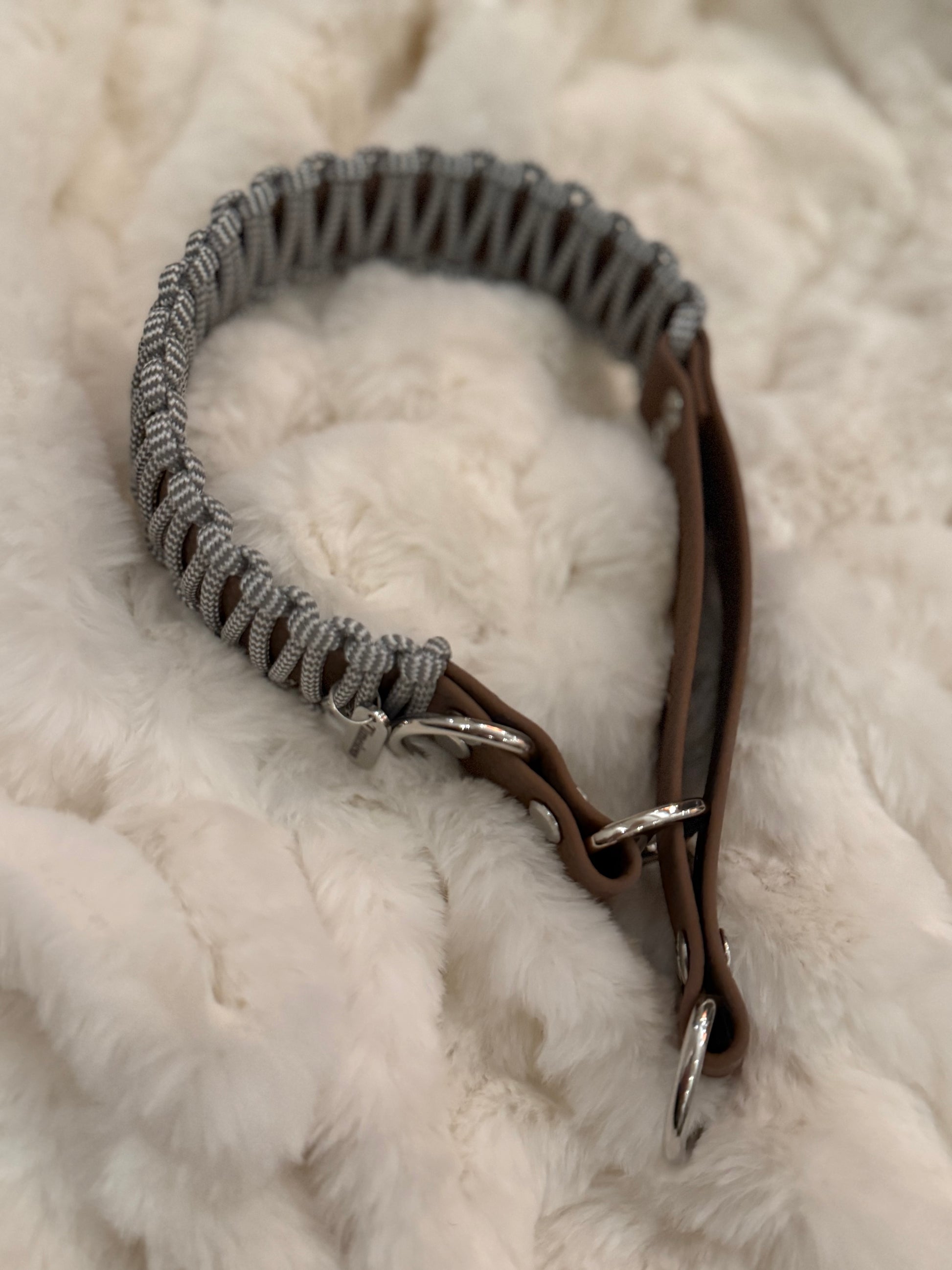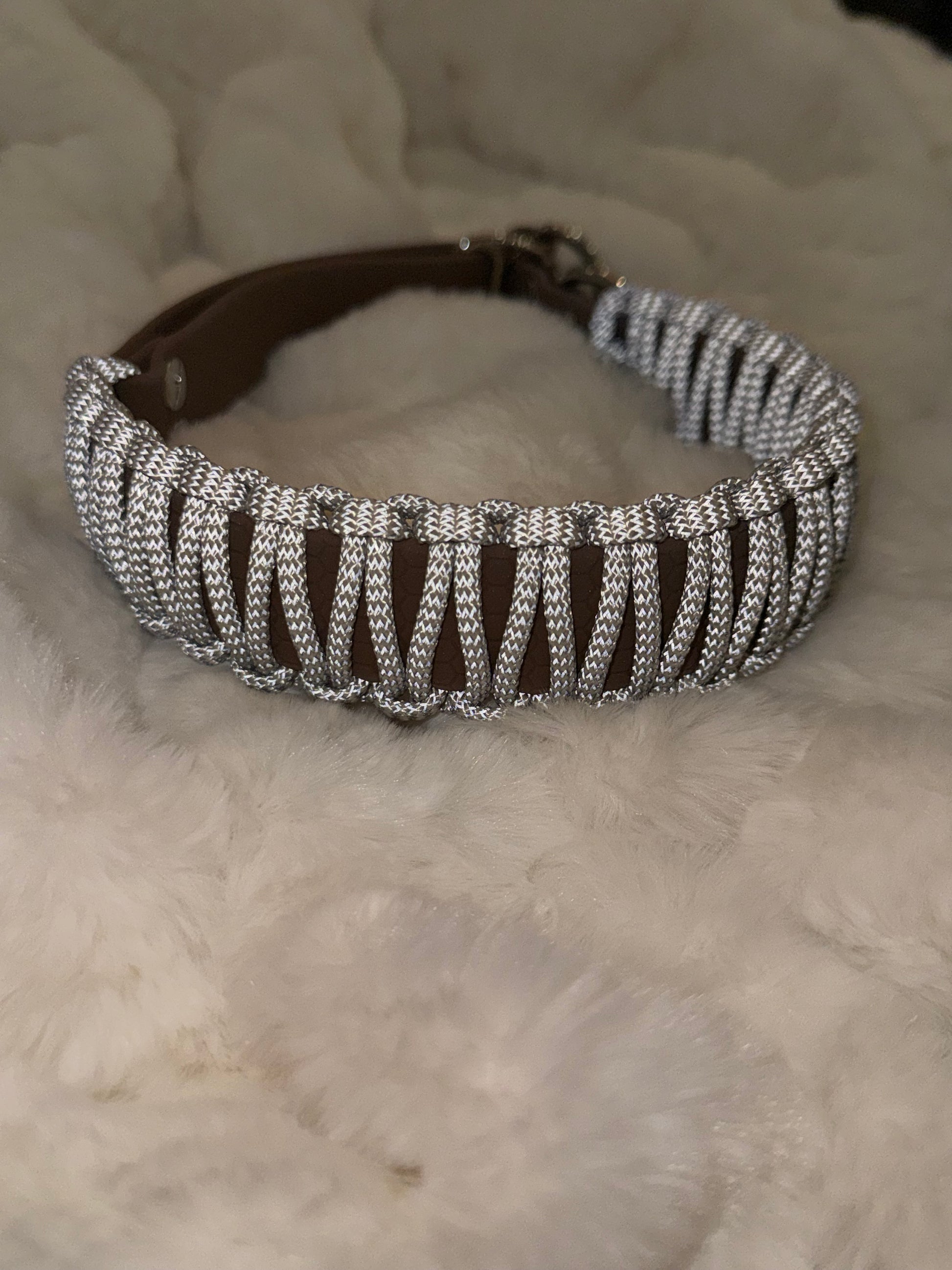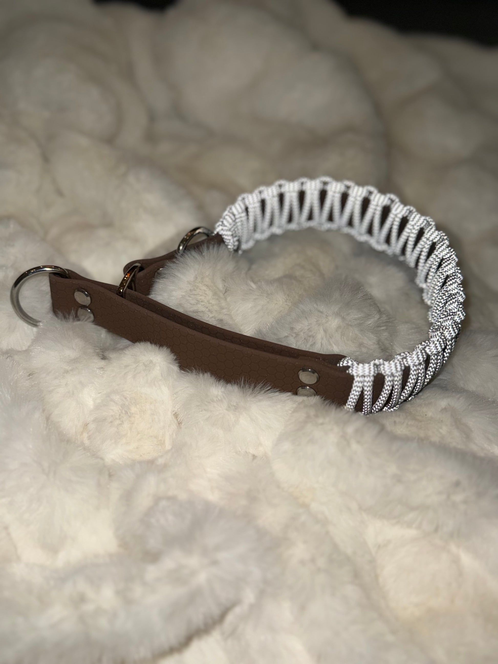 Ett stilrent och funktionellt halvstryp-halsband handgjort i reflex paracord och stabil hexa webbing. Reflex paracord ger extra synlighet i mörker, medan den vävda designen ger en bekväm och följsam passform runt hundens hals.