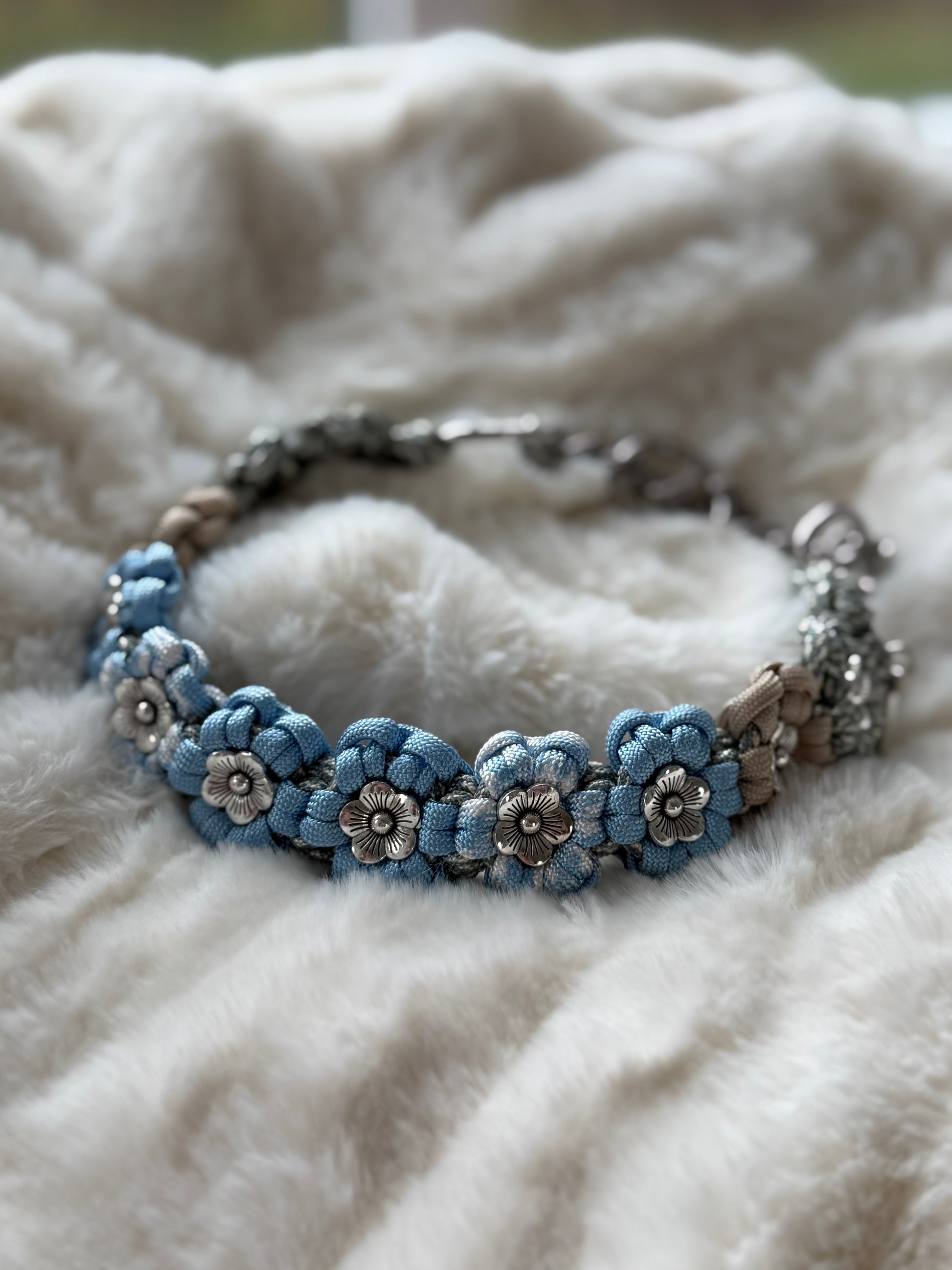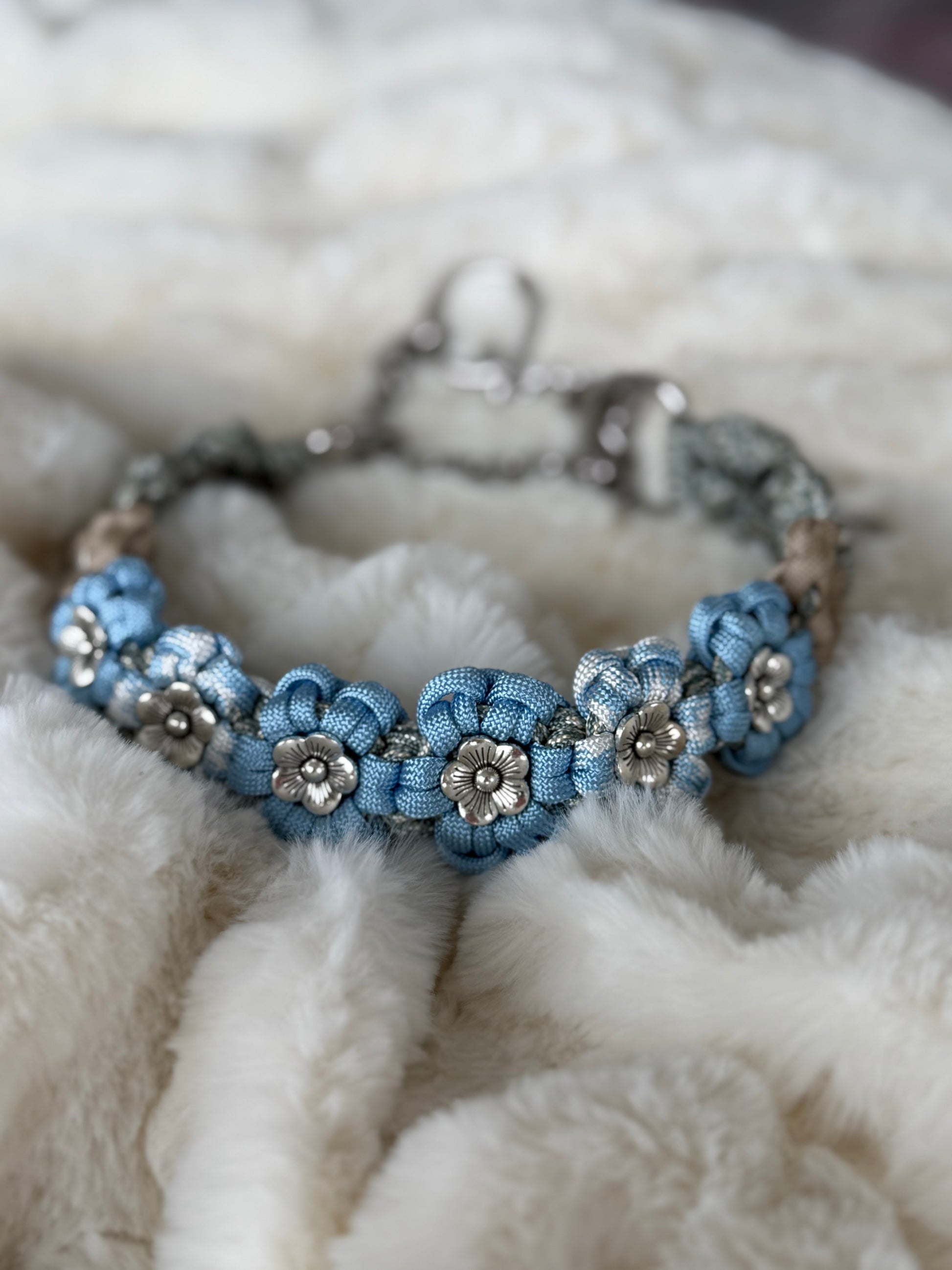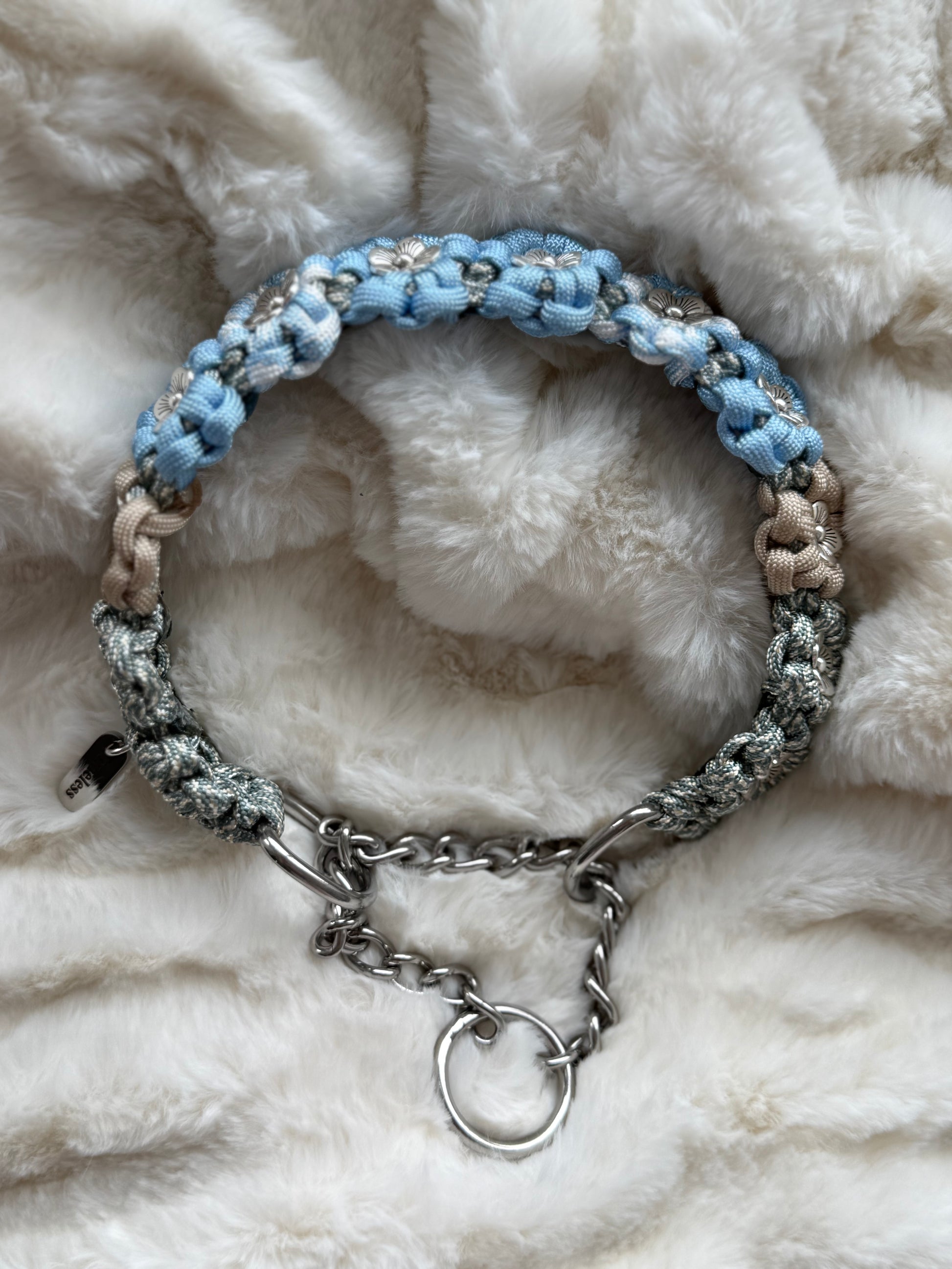 Våra handgjorda paracordhalvstryp är skapade med fokus på både stil och kvalitet. Varje halsband flätas för hand med stark paracord och dekoreras med vackra blommor. Resultatet är ett halsband som inte bara är hållbart – utan också ett smycke för hunden. Den rostfria kedjan ger extra kontroll och hållbarhet.